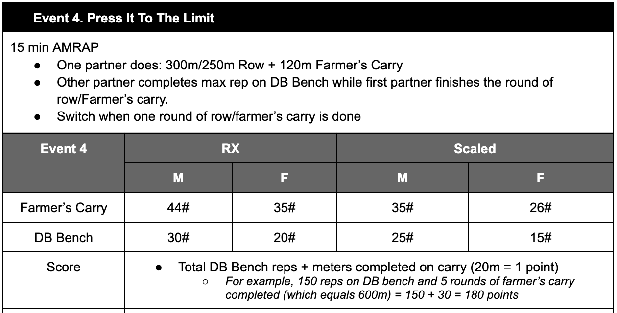 This is a longer time-domain, indicating a more aerobic piece with strength components. The previous exercises were primarily lower body (deadlift, squats, wall ball), which means we HAVE to show some love for DB benching. Although the weights for DB bench are not heavy, remember you will be benching for max reps in a ~2-3 minute time period (depending on how fast your partner is completing their rowing and carries).