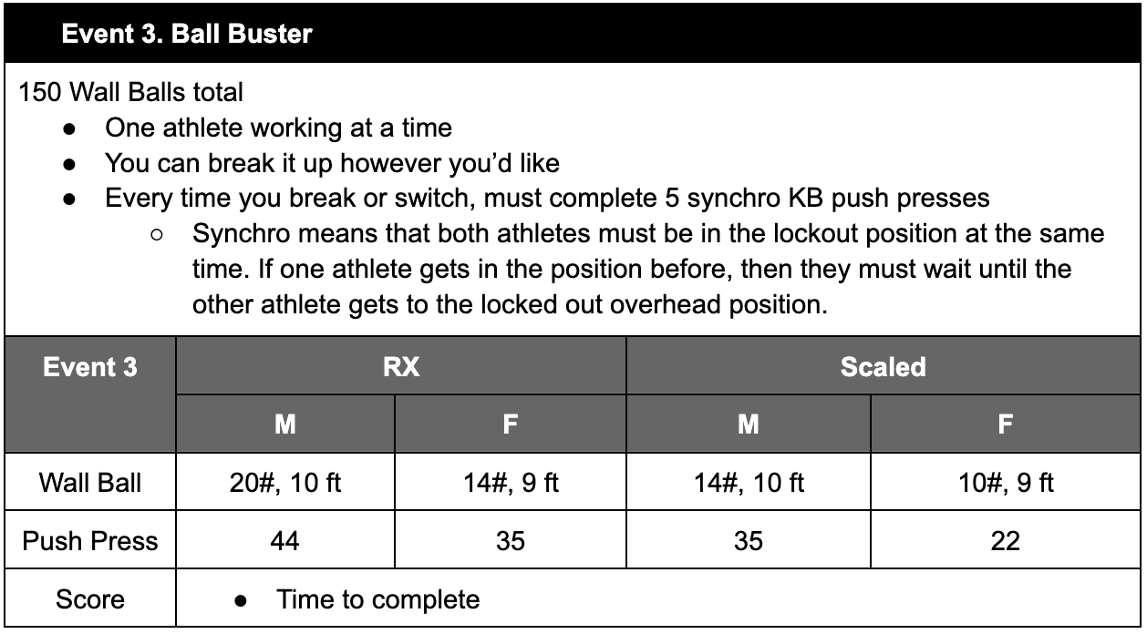 What: The Telos Partner Competition is an annual event. This year, the event will consist of 4 workouts, ranging in time domains, skill, and energy systems.