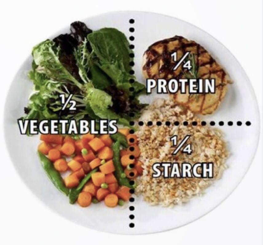 - ¼ plate protein (chicken, fish, eggs, Greek yogurt, lean beef, tofu)