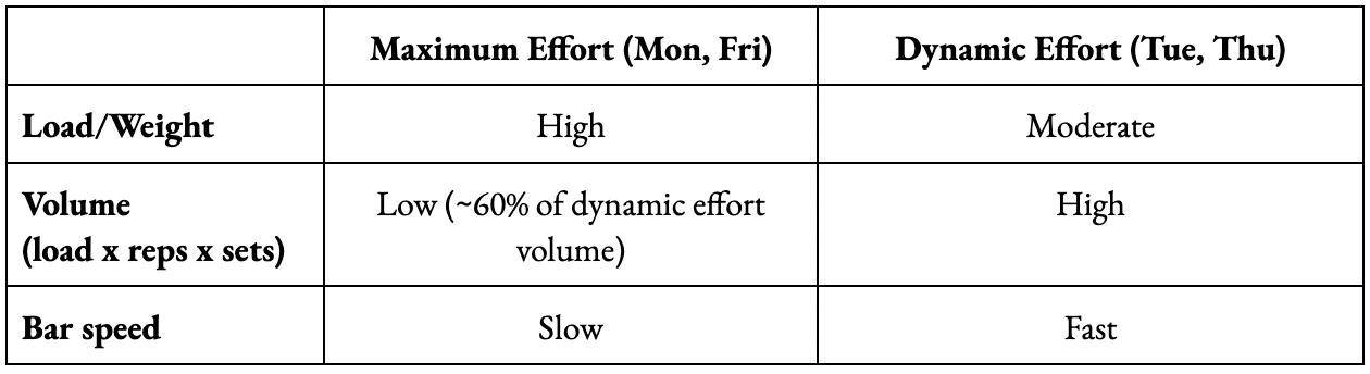 To prevent reaching any level of overtraining, we introduce dynamic effort training into the program. We perform dynamic effort at least 72 hours before/after the max effort attempts. For example, if we did max effort lower body on Monday, then the next day we will do lower body is 3 days later (Thursday) and it will be dynamic effort work.